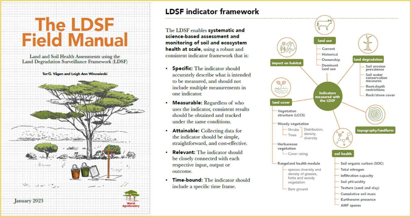 The Land Degradation Surveillance Framework (LDSF): a standardised methodology for biophysical data collection that feeds into machine learning models to generate high-resolution predictive maps of soil and land health indicators. These maps are integrated into decision-support tools such as dashboards, posters, and reports that help stakeholders target interventions, monitor progress, and report against commitments.